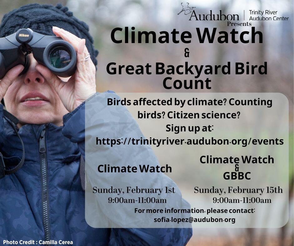 Join us on February 1st and 15th as we participate in two nationwide community science efforts led by Audubon: Climate Watch and the Great Backyard Bird Count (GBBC). Together, these programs invite participants to observe and record bird species while contributing valuable data that helps scientists track bird populations, migration patterns, and the impacts of climate change. This hands-on experience is open to all skill levels and offers a meaningful way to connect with nature while supporting bird conservation through real-world research.